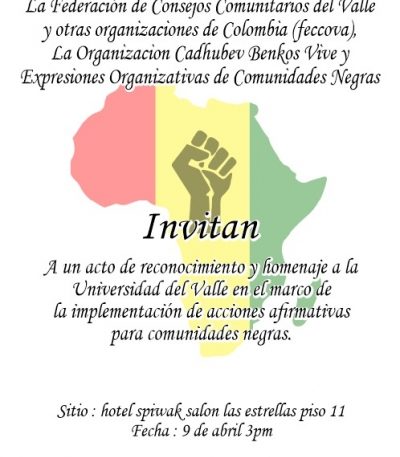 Por la implementación de acciones afirmativas para las comunidades afrodescendientes, la Federación de Consejos Comunitarios del Valle y Otras Organizaciones de Colombia – FECCOVA, la organización CADHUBEV Benkos Vive y Expresiones Organizativas de Comunidades Negras realizarán un homenaje a la Universidad del Valle.