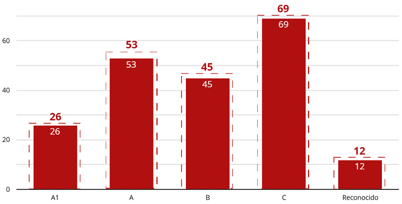 En cuanto a la distribución por categorías, la categoría C concentra el mayor número de grupos (33,7%), seguida de la categoría A (25,9%), la categoría B con 45 grupos (22%), la categoría A1 con 26 grupos (12,7%) y 12 grupos reconocidos (5,9%). Este comportamiento refleja un sistema de investigación equilibrado, con una presencia destacada en las categorías de mayor nivel y una base amplia en procesos de fortalecimiento y consolidación.