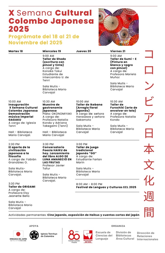 La Escuela de Ciencias del Lenguaje, la Dirección de Relaciones Internacionales y el Área Cultural de la División de Bibliotecas de la Universidad del Valle, con el apoyo de la Embajada del Japón y la Iglesia Tenri de Cali realizan del 18 al 21 de noviembre de 2025 la X Semana Cultural Colombo Japonesa.
