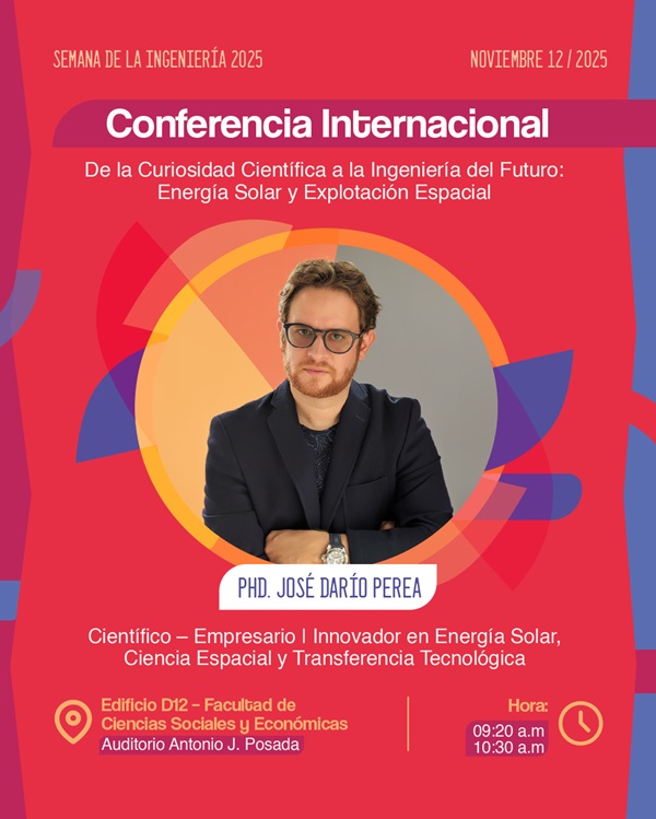 El 12 de noviembre dará inicio el evento en el Auditorio Antonio J. Posada (Edificio D12) con la presentación del Coro Magno, las palabras de bienvenida institucional y una conferencia que promete inspirar a toda la comunidad universitaria: “De la curiosidad científica a la ingeniería del futuro: Energía solar y exploración espacial”, a cargo del PhD. José Darío Perea, científico y empresario colombiano que ha logrado tender puentes entre la investigación aplicada y la industria tecnológica internacional.