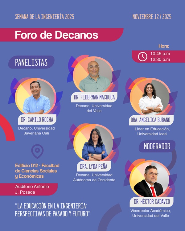 A continuación, el Foro de Decanos en Ingeniería, con representantes de la Universidad del Valle, la Universidad Autónoma de Occidente, la Javeriana Cali y la Universidad Icesi, abordará los desafíos de la educación en ingeniería en un mundo en constante transformación. El debate estará moderado por el Dr. Héctor Cadavid, Vicerrector Académico de Univalle, en un espacio que se perfila como un hito del diálogo académico regional.